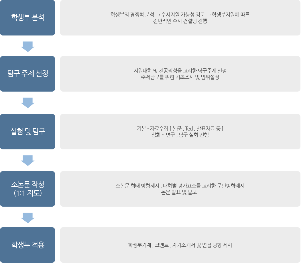 • 소논문(R&E)컨설팅 은 학교에서 인정하는 활동으로 만들 수 있도록 소논문 관련 A부터 Z까지 컨설팅이 이루어 지는 과정입니다.